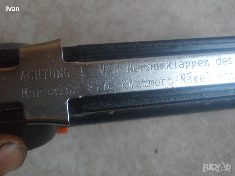 Made in GERMANY - 1997г - старото профи произзводство висок клас. Такера е в ОТЛИЧНО техническо8работно състояние. Без забележки.- силен и мощен удар. 20 удара/мин.Функция заключване на спусъка, стоманена глава, стоманен пълнител, твърда пластмаса корпус. Заредед с дуцина скоби за проба и тест. Цена - 129 лв.