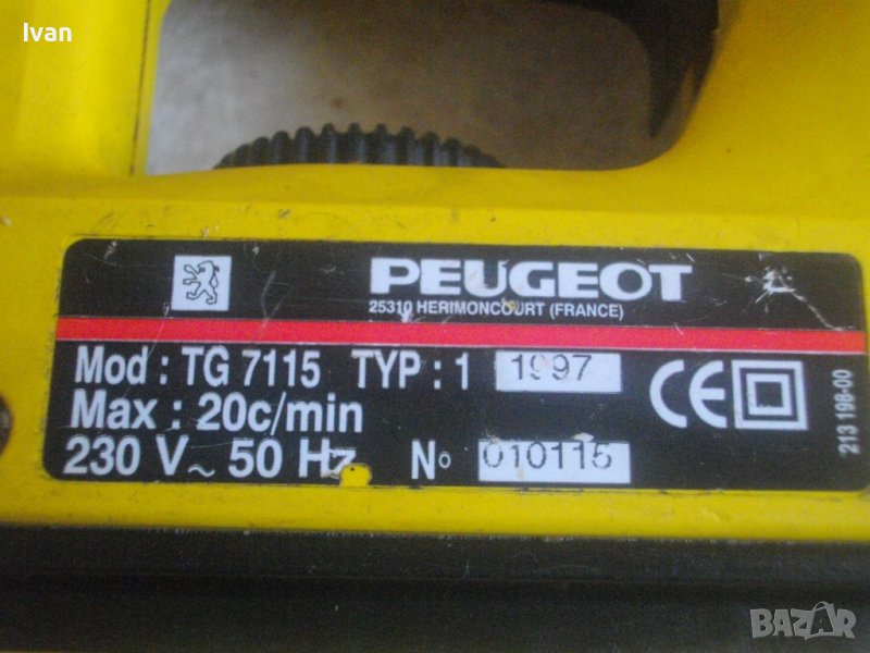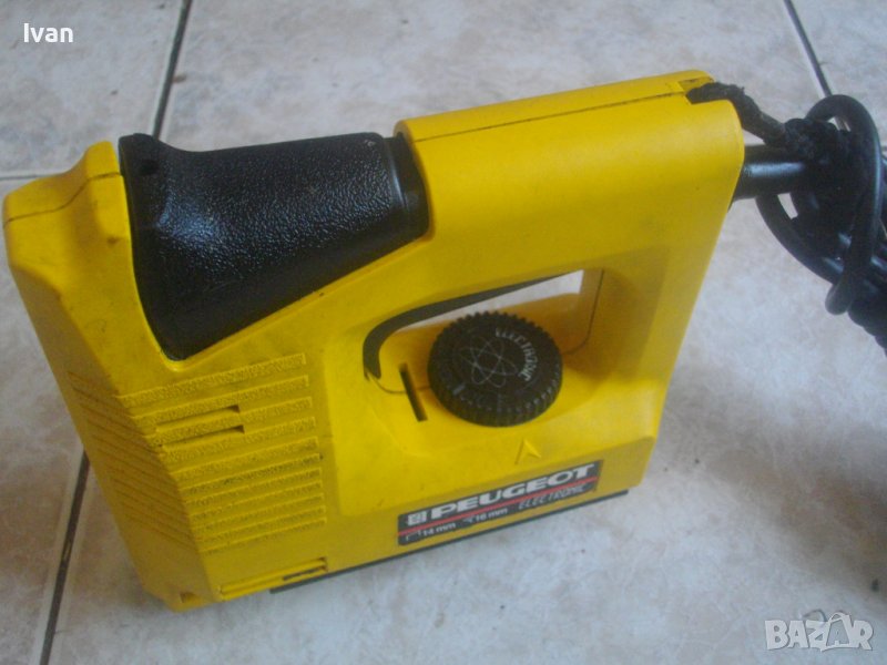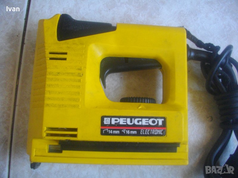 ОПИСАНИЕ на френски профи Пежо такер - 159 лв. Отличен дърводелски професионален такел, с алектронен контрол на скоростта, професионален френски оригинален модер на Пежо. Марка и модел на машината - PEUGEOT ELECTRONIC . Производство - оригинално френско 1997 г - FRANCE. Старото, висококачествено профи произвосдтво от едно времеу което в съвремието липсва. Такера е за дърводелски пирони 16 мм и кламери - скоби размер 14 мм. Много запазен външен вид и отлично техн. състояние. работи много добре. Удара е силен и мощевн. Електронен контрол на скоростта и ръчен 7 степени. макс 20 удара/мин. Корпус - бакелитова пластмаса. Автозащита на спусъка. Платова вързалка за удобно носене на ръката. Глава и пълнител - метални. Машината е заредена с дузина скоби - кламери за проба и тест в офис Еконт.