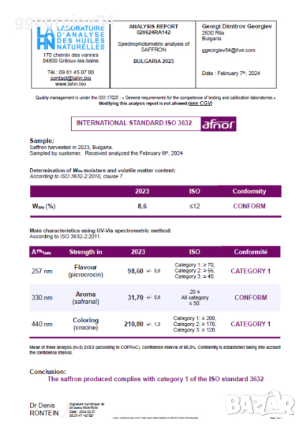 Здравейте. Вече 5-та поредна година произвеждам 1-во чакествен шафран, който сертифицирам във Френска лаборатория. Шафрана се отглеждат в гр. Рила, подножието на Рила планина и е с наситен винено червен цвят, има страхотен аромат и само с няколко стигми оцветява идеално храни и напитки. Отглеждам го без използването на торове и препарати. Ползите от шафрана са многобройни, като някой от тях са: мощен антиоксидант, може да подобри настроението и да лекува депресивните симптоми, засилва имунната система, подобрява съня и още много други. Цените за шафран са: