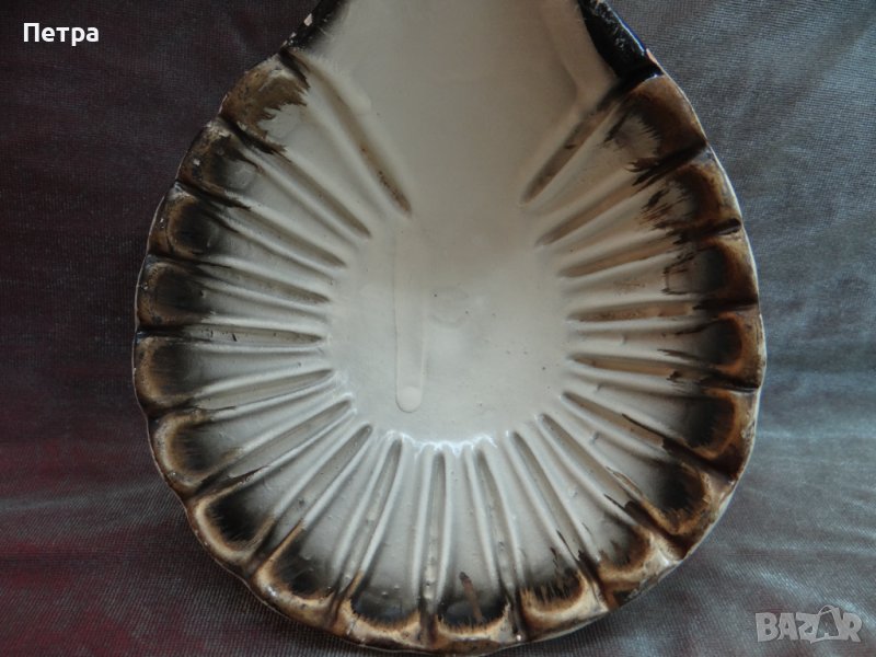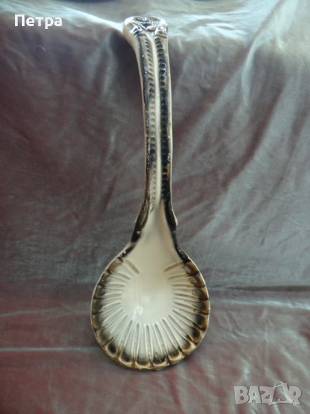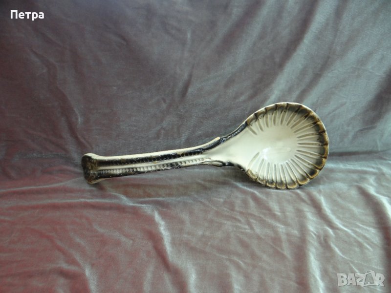 Голям керамичен черпак с дължина 28,5 см., ширина на дръжката 2 см., диаметър на разливната част 10 см., мъничка забележка на дръжката, цена 20 лв.
