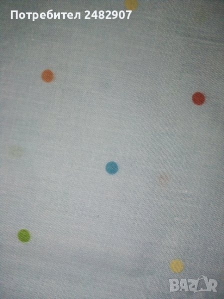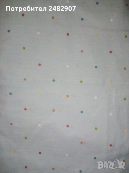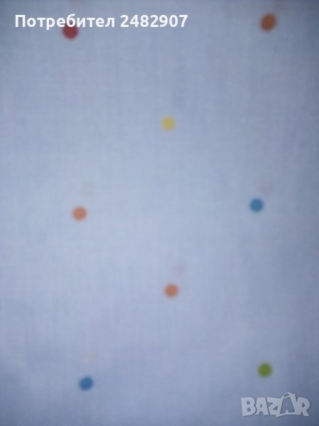 Единичен спален комплект в светло синьо с разноцветни точки. Състои се от 1 бр. долен чаршаф с ластик - 180/120/27 см и 2 бр. калъфки за възглавница - 44/65 см. Съдържа 50 % памук и 50 % полиестер. Ластик е на късите страни. Цената е за комплекта.