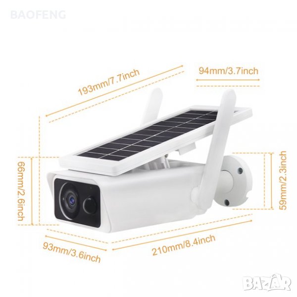 Соларна безжична Wi-FI IR камера с автномно захранване. Full HD резолюция, вграден говорител и слот за SD карта с памет до 128GB. Камерата разполага с PIR сензор за детекция на движение и дава възможност за нощно видеонаблюдение до 20 метра. Отдалечено наблюдение в реално време и преглед на записите през мобилно устройство с приложенията.. Поддържа две акумулаторни батерии тип 18650. Заряд на батериите чрез соларния панел. Соларният панел е подвижен и дава възможност за регулиране на ъгъла на приемане на сълчевата светлина. Подходяща за външен монтаж.