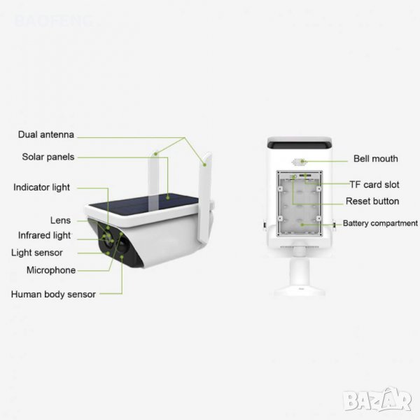 Соларна безжична Wi-FI IR камера с автномно захранване. Full HD резолюция, вграден говорител и слот за SD карта с памет до 128GB. Камерата разполага с PIR сензор за детекция на движение и дава възможност за нощно видеонаблюдение до 20 метра. Отдалечено наблюдение в реално време и преглед на записите през мобилно устройство с приложенията.. Поддържа две акумулаторни батерии тип 18650. Заряд на батериите чрез соларния панел. Соларният панел е подвижен и дава възможност за регулиране на ъгъла на приемане на сълчевата светлина. Подходяща за външен монтаж.