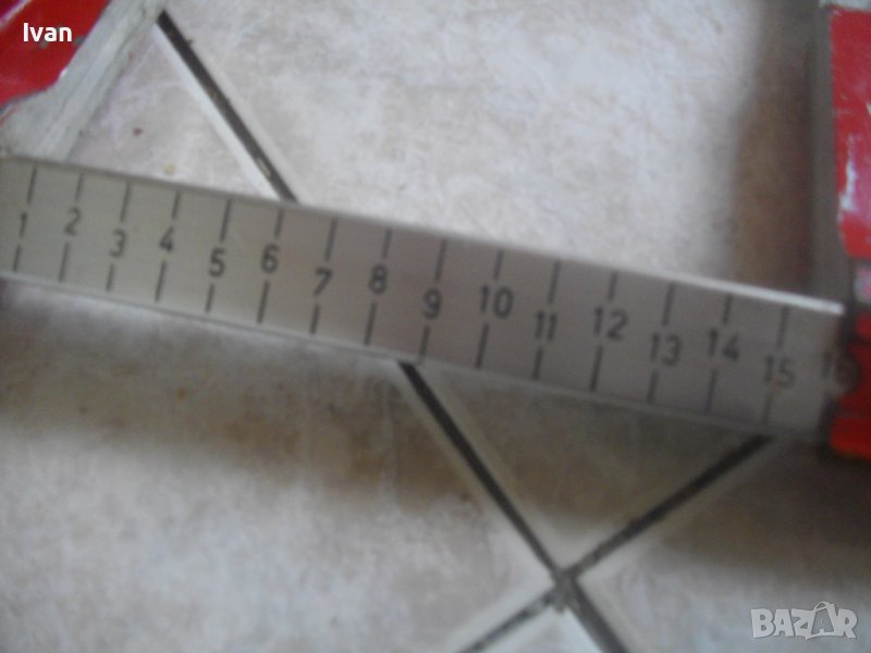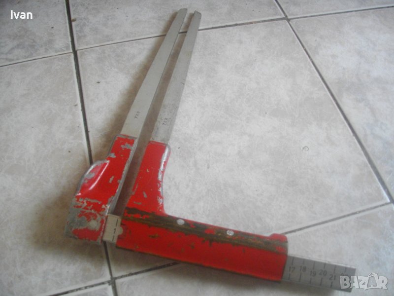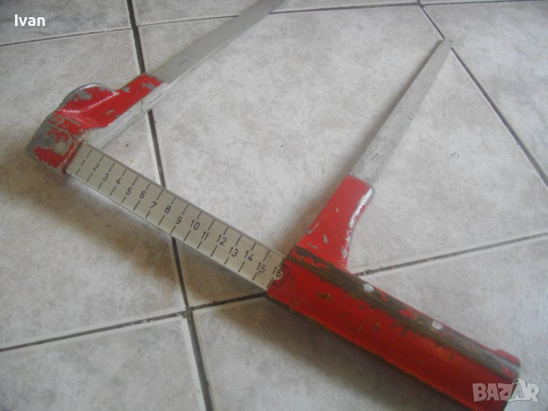 ОПИСАНИЕ на Клупа дърводелска/дърводелски шублер - сантиметров - 22 см-челюсти 36 см -изцяло алуминиев- цена 79 лв. Голям масивен,изцяло алуминиев шублер за измерване до 22см,с линеал само в сантиметри-клупа..Инструмента се ползва предимно в сферата на дървообработването и дърворязането за измерване на кубатурата на отрязано дърво.Чукчето отгоре е за маркиране.Професионален е.Немско качествено професионално производство.Линеала фабрично е по дълъг,но е отрязан до 22,5 см,за по-голямо удобство при работа.Всичко по инструмента е алуминиево.Плъзгач,челюсти,линеал.Маркиран е със сериен номер-788.Издължени огромни челюсти-дължина-36см.Линеала е триъгълен,вътре кух.Алуминият по инструмента е много дебел и масивен.Горната външна страна на горната челюст е оформена като чук.