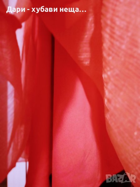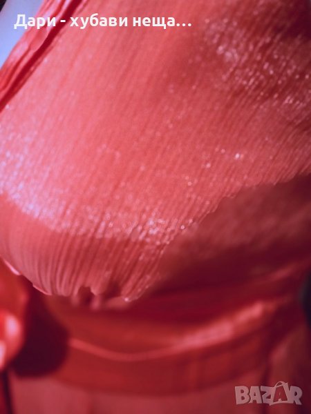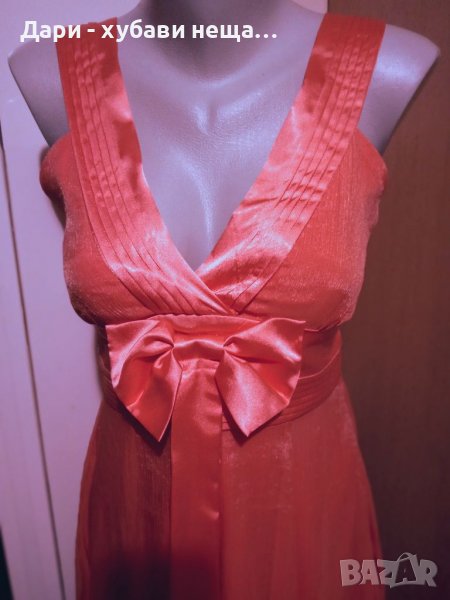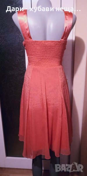 Много красива и в отлично състояние!Цветът е светъл корал.Дължината е около коляното и зависи от фигурата и ръста.ГО около 95-96см.Горната част е шифон с намачкан ефект и лъскавина, а втория пласт е еластичен полиестер.Роклята е със висока талия.Дължина 92см., Широчина под гърдите, където е колана от 36 до 43см.
