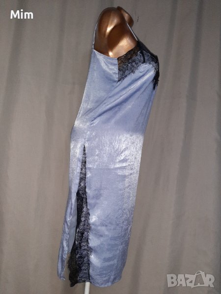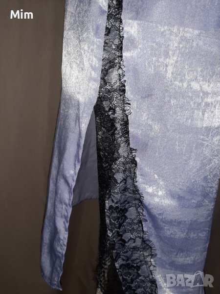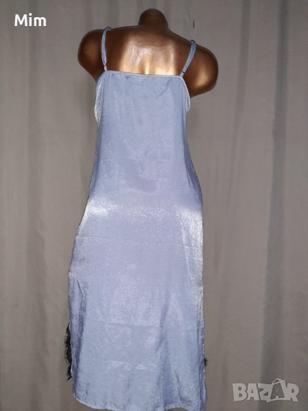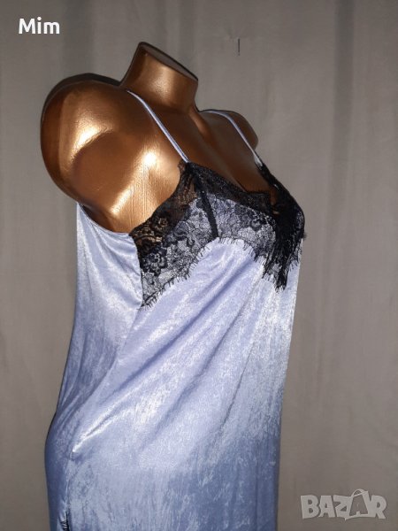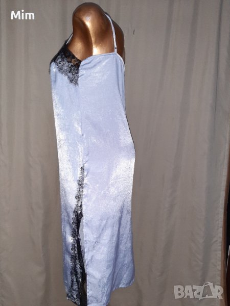 Сива дълга сатенена нощница с черна дантела на бюста и странично на цепките ,мека чашка регулируеми презрамки, подгръдна 48 см едностранно, ханш 53 см едностранно дължина от подмишници 85 см. Няма забележки