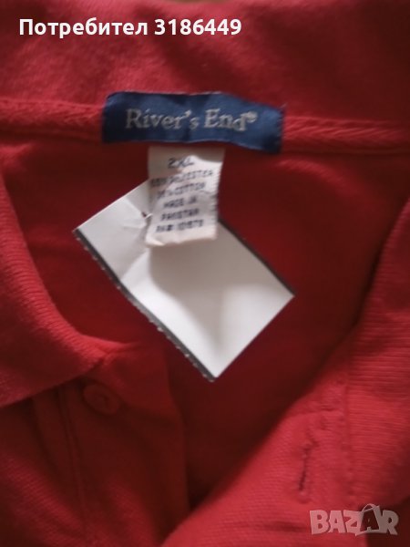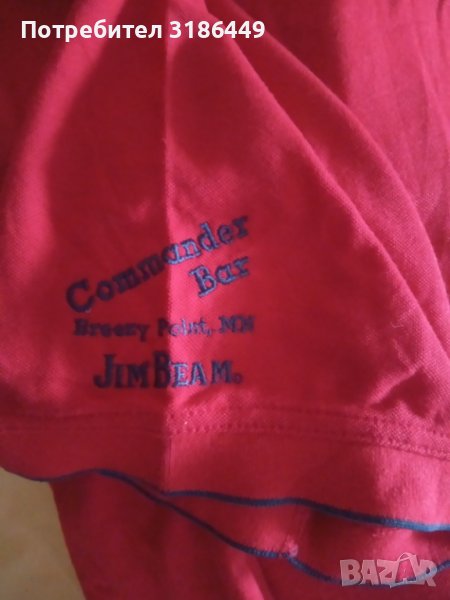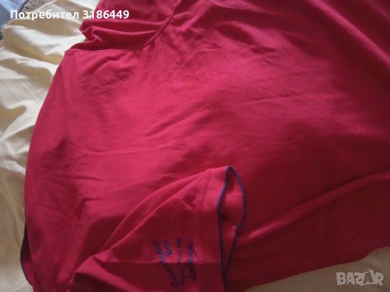 Предлагам 1бр. голяма, червена, памучна тениска с яка, с къс ръкав, памучна хубава материя, за едър човек, престояла в гардероба. Дължина 85см. Има страничен надпис на единия ръкав. Предницата и гърбът са чисто червени.