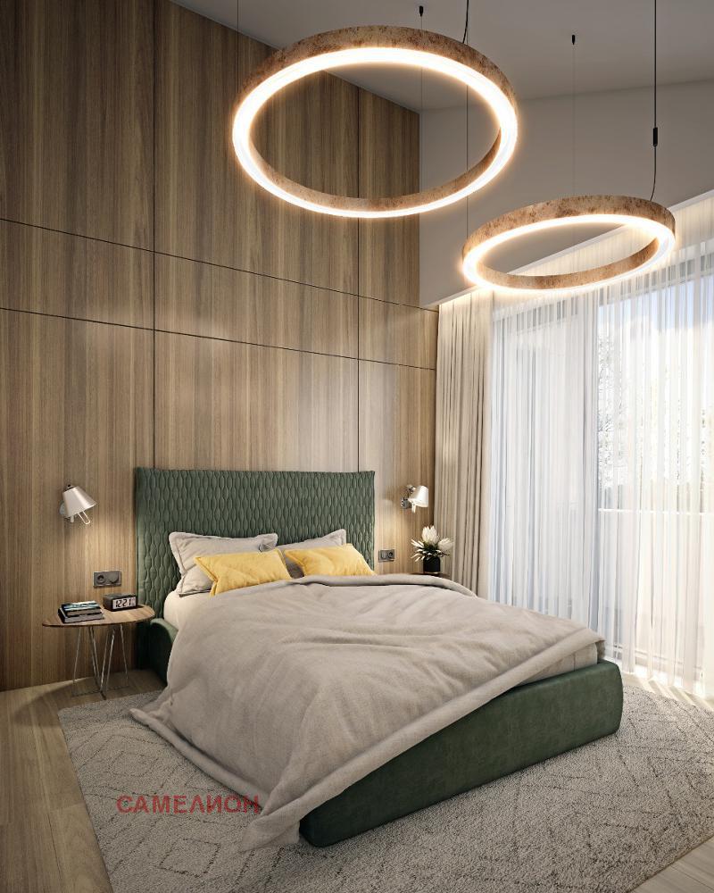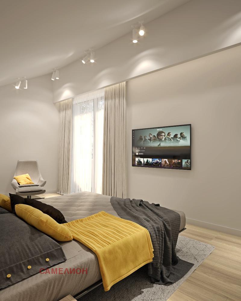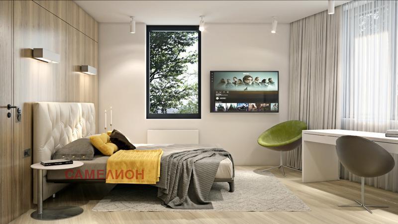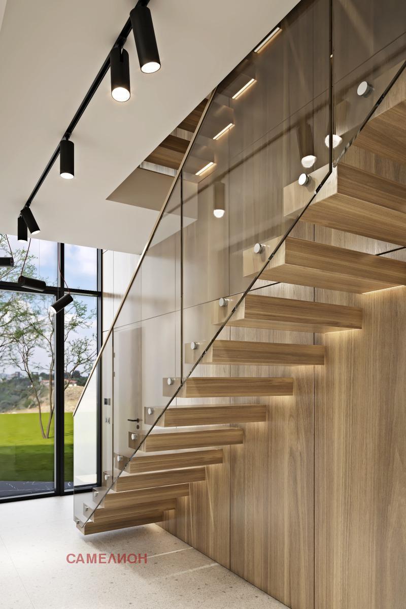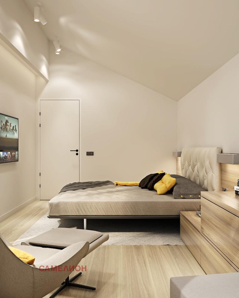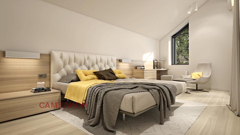 На втория етаж са разположени: спалня със собствен санитарен възел, спалня със собствена гардеробна и санитарен възел, спалня с гардеробна, санитарен възел, сауна, перално помещение и две тераси.