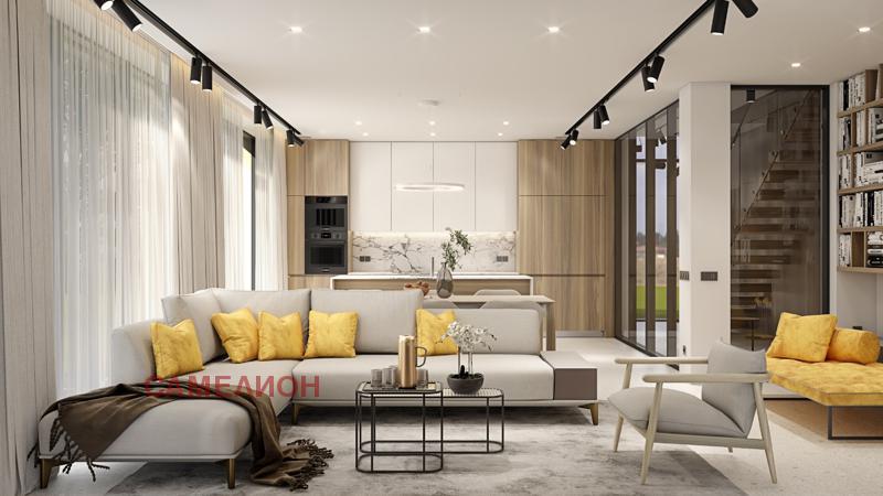 На първи приземен етаж са разположени следните помещения: входно преддверие, дневна с кухня и трапезария, преходно гардеробно помещение, тоалетна, техническо помещение, обслужващо помещение, гараж за два автомобила и покрита тераса.