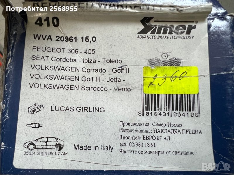 SIMER 410 Задни накладки CITROEN PEUGEOT RENAULT SEAT VW 1983-2004 OE 1H0698451B OE 1668247480  , снимка 1 - Части - 37532724 SIMER 410 Задни накладки CITROEN PEUGEOT RENAULT SEAT VW 1983-2004 OE 1H0698451B OE 1668247480  , снимка 2 - Части - 37532724 SIMER 410 Задни накладки CITROEN PEUGEOT RENAULT SEAT VW 1983-2004 OE 1H0698451B OE 1668247480  , снимка 3 - Части - 37532724 1/3