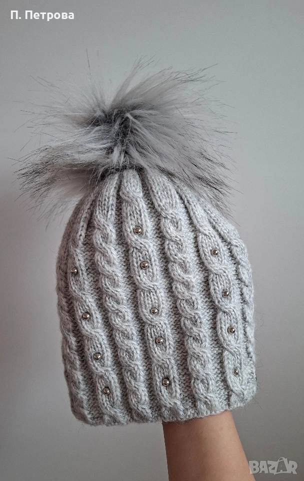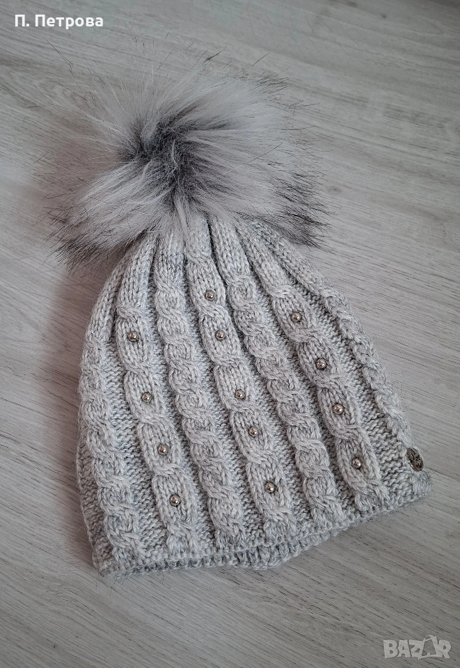сива плетена зимна шапка с мъниста и пухкав помпон → Обява 37534261