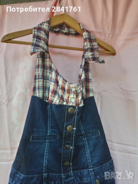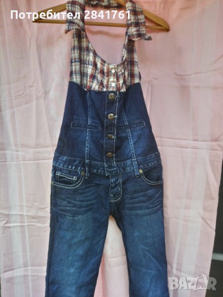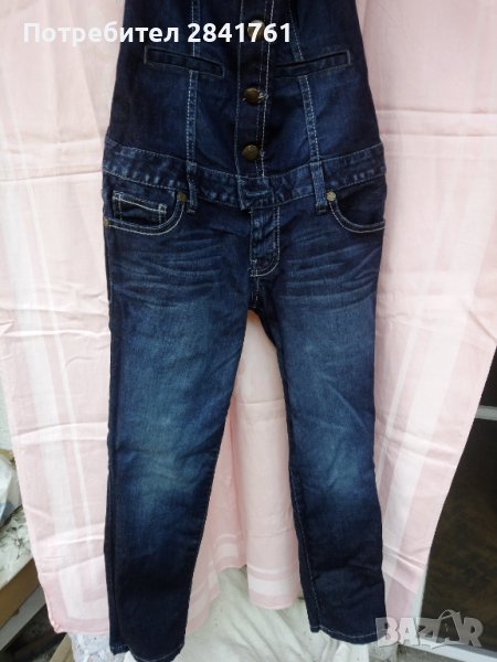 Дънков марков гащеризон Guess. В горната част е оформен като бюстие от кариран плат с гол гръб. Размер S, но според мен отговаря на XS. Вътрешната дължина на крачола е 60см,7/8 размер. Би станал на много слабо и невисоко момиче. Платът има еластичност. За съжаление не мога да му направя хубави снимки, но е много интересен. Обличана е един - два пъти.