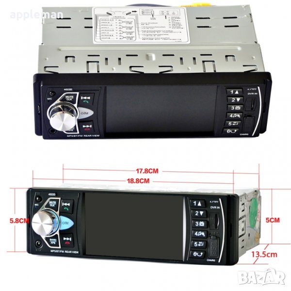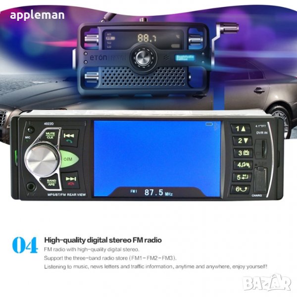Най-нов модел, качествена мултимедия Mp3 / Mp4 / Mp5 Car Player - възпроизвежда на дисплея видео клипове, филми и музика и пасва идеално на по-старите коли с място за стандартно радио. Използва се и като handsfree за лесно провеждане на разговори.