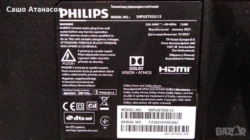 PHILIPS 50PUS7555/12 с счупена матрица ,715GA052-P02-008-003M ,715GA564-M01-B00-005Y ,CDW-558192F-00