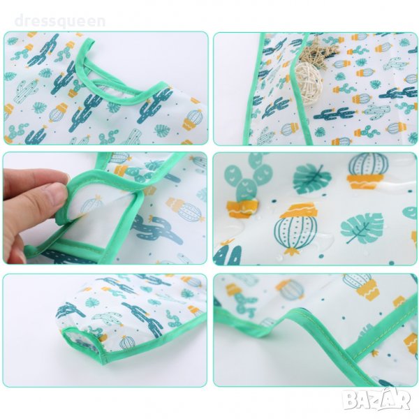 Перфектно създаденият дизайн с дълги ръкави позволява на децата да се забавляват свободно докато се хранят, а дрехите им да останат чисти без петна. Лигавникът е изработен е от Еко материята PEVA, което е напълно безопасен за вашето бебе и е лесен за почистване. Не съдържа канцерогенни и вредни бои. Закопчава се удобно на гърба с велкро залепваща лента.