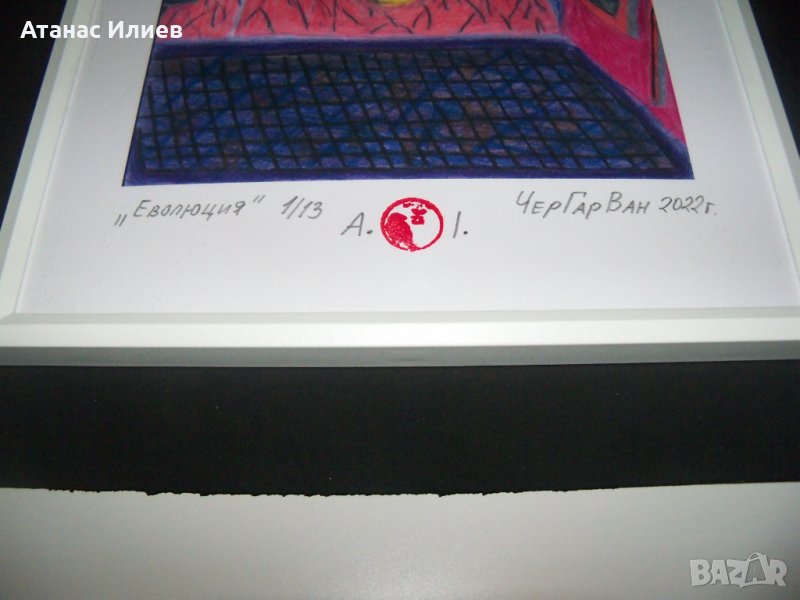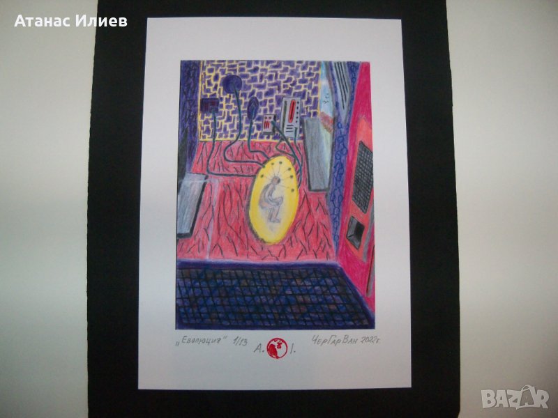Картина "Еволюция" на художника ЧерГарВан псевдоним на Атанас Илиев. Картината е тиражно изкуство, рисувана с акварелни моливи, сканирана и обработена на компютър, след което е отпечатана в 13 екземпляра на специална фотохартия 170гр. Картината е първи отпечатък от 13. Картината е подписана и датирана от автора и подпечатана с личния му печат. Размери с рамката 30х21 см. Картината е илюстрация по едноименният му разказ, разказите му можете да прочетете в блога "Гарванови истории".