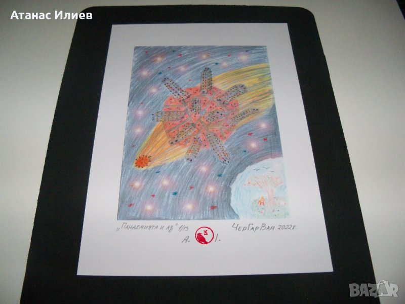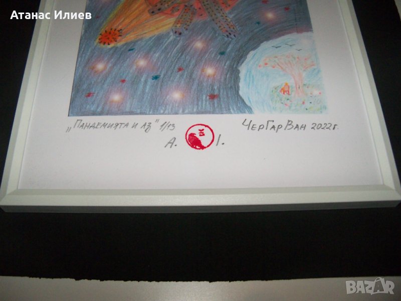 Картина "Пандемията и аз" на художника ЧерГарВан псевдоним на Атанас Илиев. Картината е тиражно изкуство, рисувана с акварелни моливи, сканирана и обработена на компютър, след което е отпечатана в 13 екземпляра на специална фотохартия 170гр. Картината е първи отпечатък от 13. Картината е подписана и датирана от автора и подпечатана с личния му печат. Размери с рамката 30х21 см.