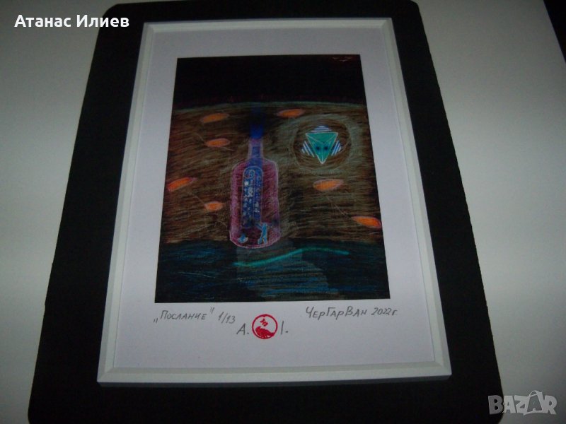 Картина "Послание"на художника ЧерГарВан псевдоним на Атанас Илиев. Картината е тиражно изкуство, рисувана с акварелни моливи, сканирана и обработена на компютър, след което е отпечатана в 13 екземпляра на специална фотохартия 170гр. Картината е първи отпечатък от 13. Картината е подписана и датирана от автора и подпечатана с личния му печат. Размери с рамката 30х21 см.