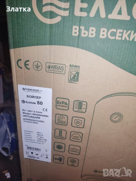 Продавам бойлер Елдом WH08046BRI - съвсем нов, неползван, не е монтиран, в кашон. Няма снимки, защото не е изваждан от кашона. Хоризонтален, не е с