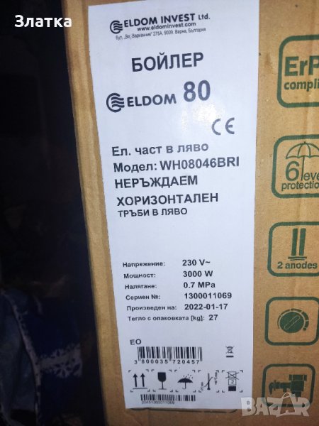 НОВ! Хоризонтален НЕРЪЖДАЕМ бойлер Елдом Eldom - WH08046BRI неползван В кашон. Електрически бойлери
