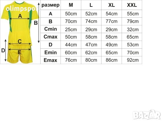 Екип за футбол/ волейбол/ хандбал, фланелка с шорти жълто. Подходящ за тренировки и официални мачове. Екип без номер. Различни размери. Мека и здрава материя. Материал: бързосъхнещ полиестер (Quick dry технология, осигуряваща бързо отвеждане на потта от кожата и изпаряването и. Създава усещане за комфорт на кожата при интензивни натоварвания). Предлагаме и услуга за термотрансфер на номера едно цифрени или двуцифрени. Разполагаме с 3 размера цифри с различна височина 8, 15 и 25см. Цената е 1.5лв. за 8см, 1.8лв за 15см. и 2.4лв за 25см цифра. В цената влиза и тази на номера.