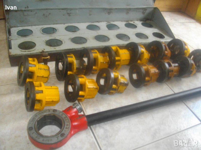 Главите са жълт цвят за ЛЯВА резба. Две от тях са съвсем нови/като нови. Другите са ползвани, но са в отлично техническо/работно състояние. Зъбите на резбонарезните
