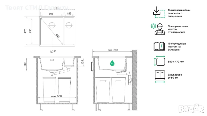 Благодарение на внимателния дизайн, нашите мивки се вписват перфектно в шкаф с размер 60 см. Спестяващият място сифон улеснява поставянето на кош за събиране на отпадъци под мивката. За улеснение на монтажа получавате практичен шаблон за изрязване на отвор в плота и подробна инструкция.
