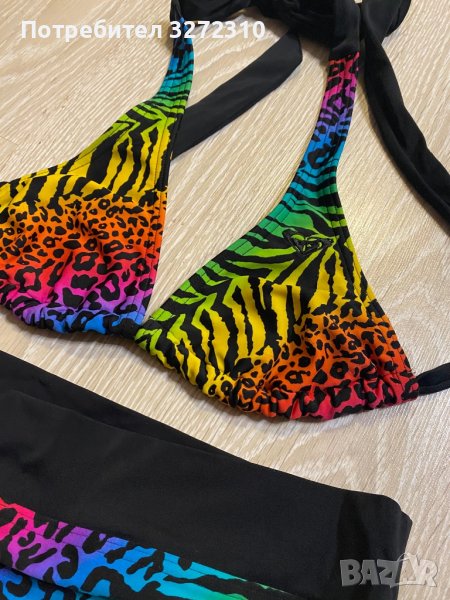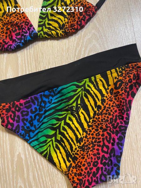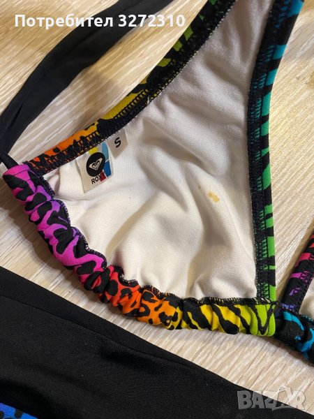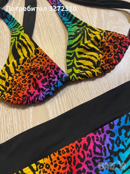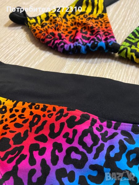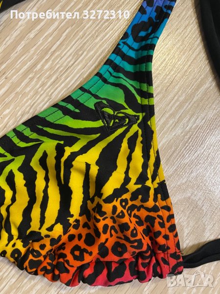 Бански ROXY от 2 части с животински десен и ярки цветове, размер S. С една единствена забележка, която се вижда само от вътрешната страна на горнището (на последната снимка). За София и Перник може лично предаване, а за останалите градове пращам с опция преглед преди плащане.
