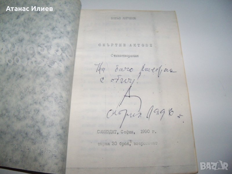 "Смъртни актове" стихове от Ботьо Ангелов. Книгата е самиздат от 1990г., направена е на ксеропечат в 30 екземпляра. Съдържа 25 стиха писани в периода преди и след 10 ноември 1989г. Последното стихотворение е писано ръчно от автора. Книгата е с посвещение от автора, като художник на корицата е отбелязан Димитър Николов. Книгата е 36 стр. и има поставен личен восъчен печат на автора. Книгата е уникално попадение и гордост за всеки колекционер.
