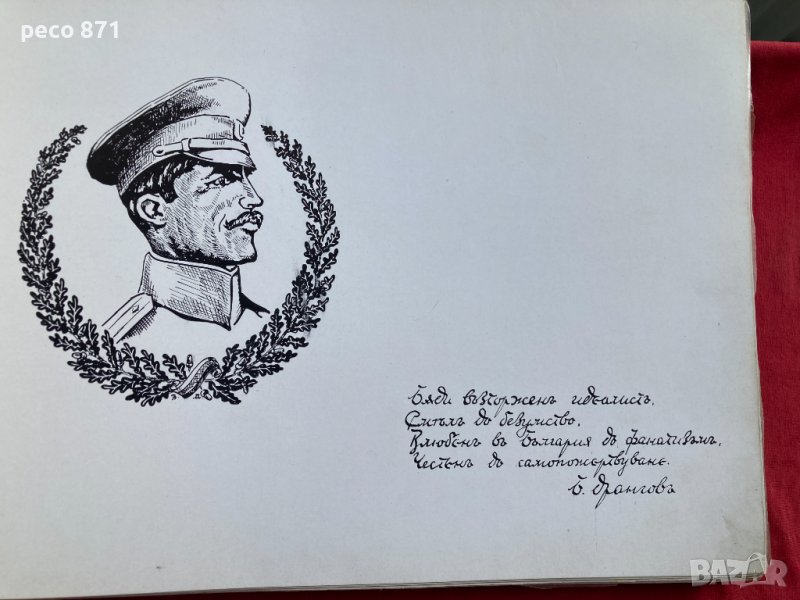 Състояние,по снимките.Предаване само на лична среща в София,района на Бъкстон или Руски паметник.Ако имате въпроси,пишете на лични.Размери 35/24,8см.,корици твърди,60листа /120стр./,последните седем страници са с пожелания и автографи за зводния командир от войниците.Състояние много-добро,два листа от оризовата хартия между страниците са се разкачили,две-три леки пожълтявания на места.