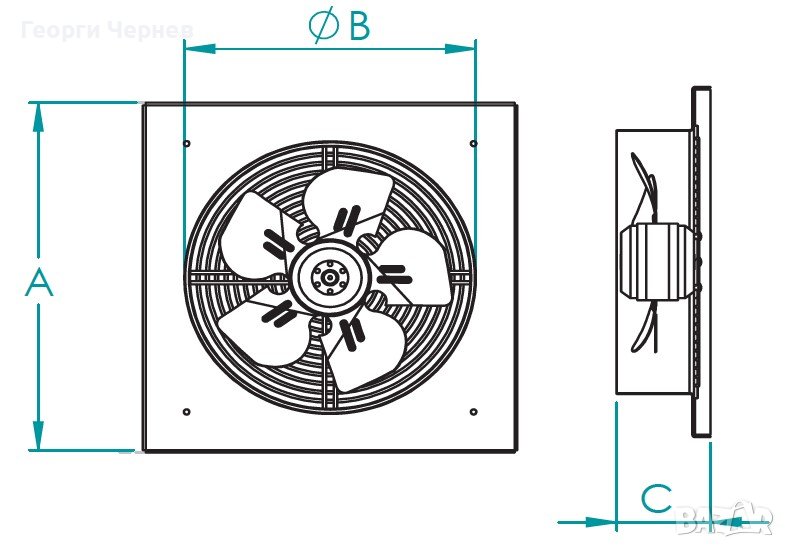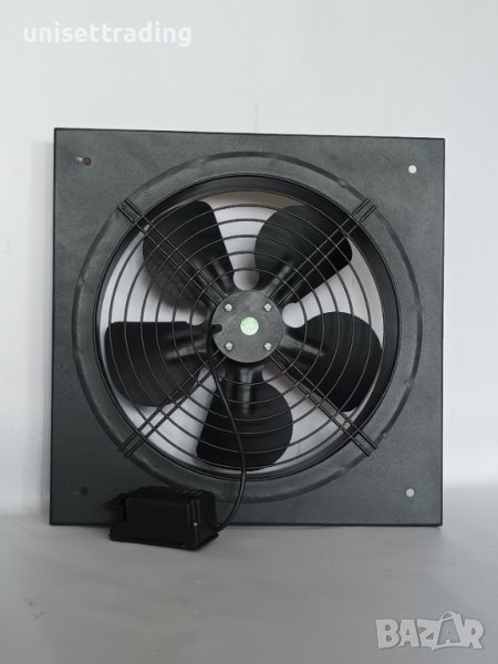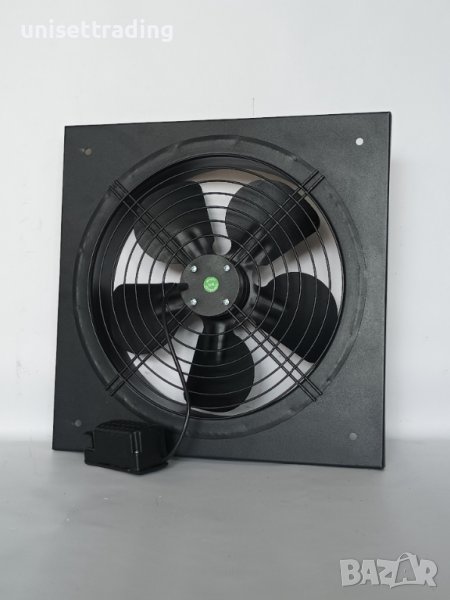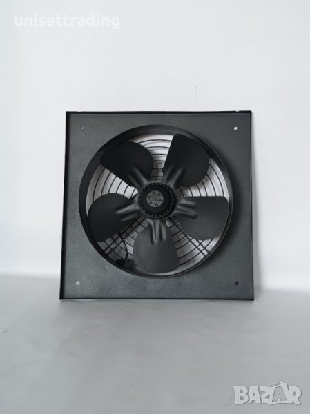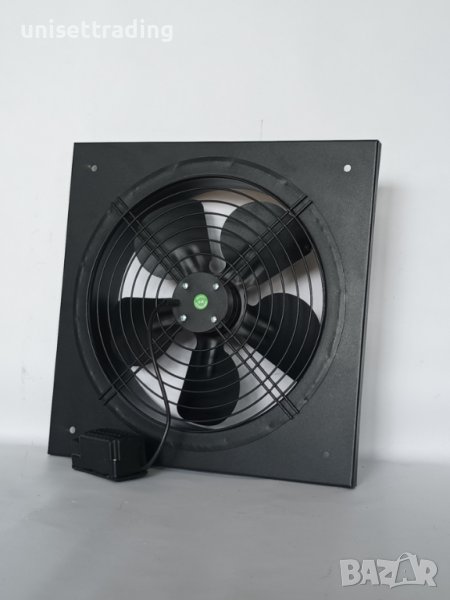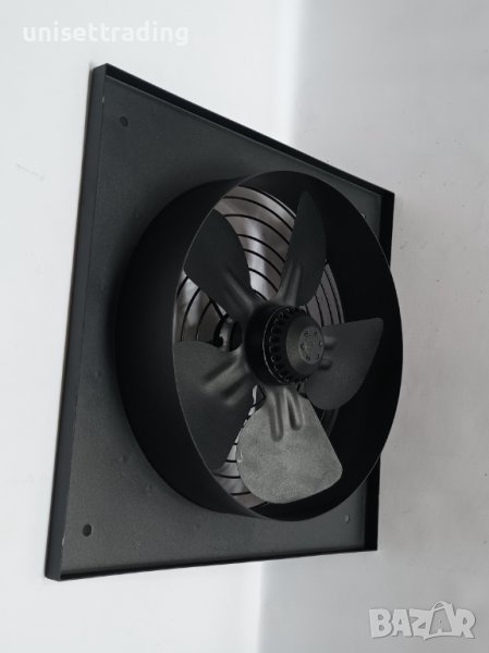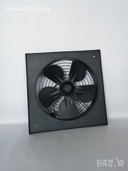 Осов вентилатор ф350, подходящ за стенен монтаж. Метален корпус и метални перки (лопатки). Защитна мрежа. Квадратна форма на лицевия панел.