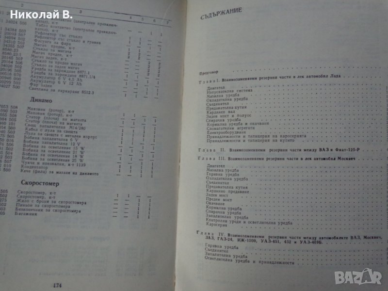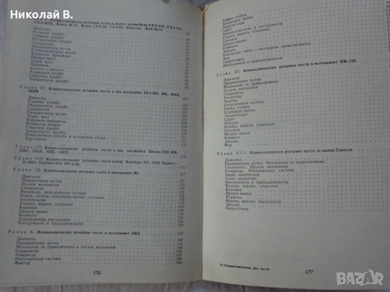 Продавам употребявана но запазена книга Взаимо заменяеми резервни части за леки автомобили и мотоциклети Техника София 1988 година съдържа 177 страници в които има данни за Лада, Москвич, Волга, УаЗ, Шкода, Вартбург, Трабант, Полски Фиат и Мотоциклети Симсон, Мз, Иж и други. Състоянието и е видно от снимките Цена 199 лв.