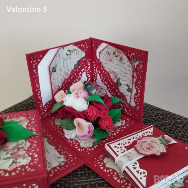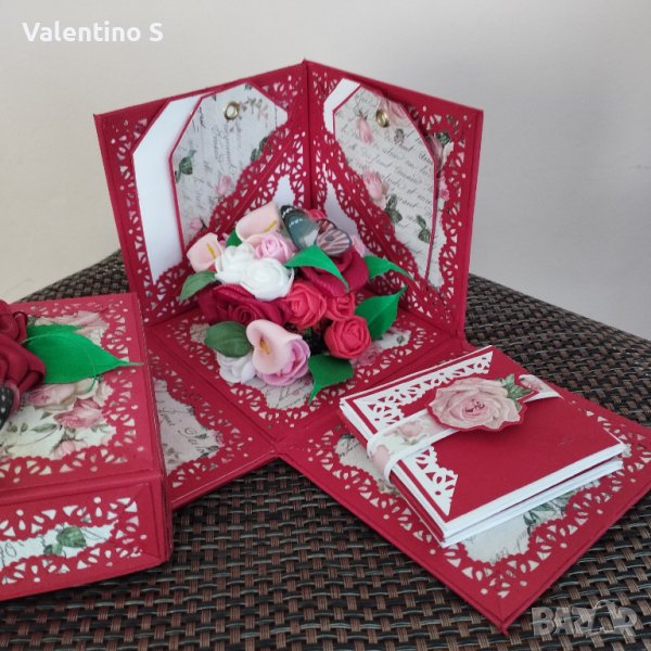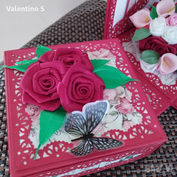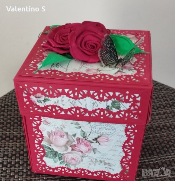 Една изключителна ръчно изработена експлодираща кутия с джобчета и тагчета за персонални съобщения, място за паричен подарък и пожелание.