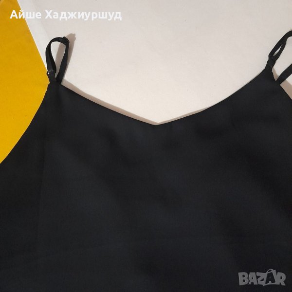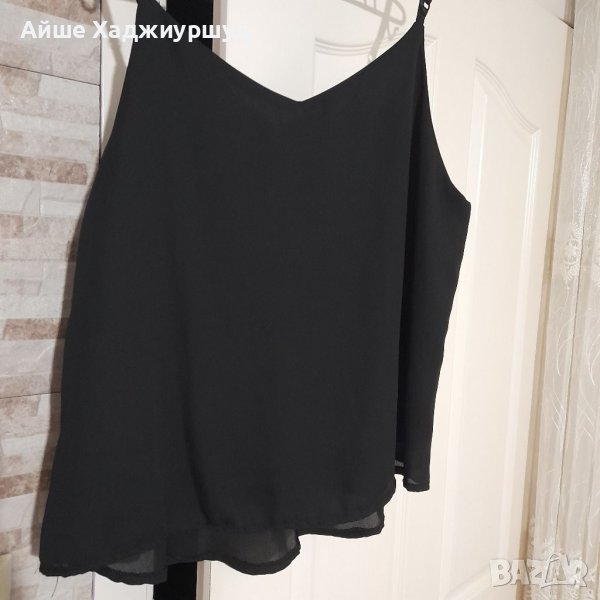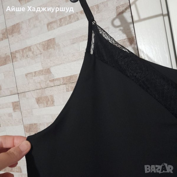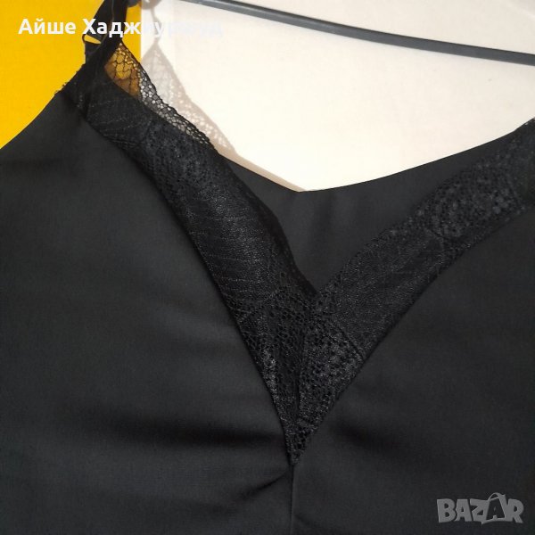Елегантен черен потник с фина дантела.С хастар, регулируеми презрамки и без никакви забележки.Материя-полиестер.