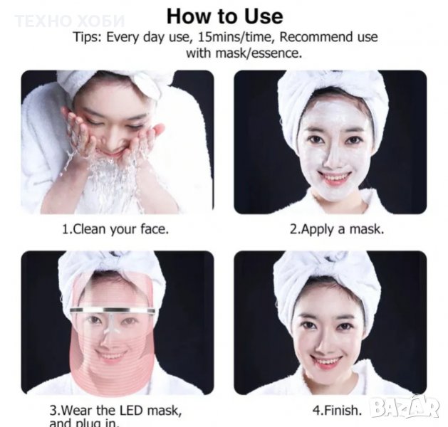 Маската има прозрачен дизайн, той няма да блокира зрението ви, можете да гледате филм, да четете книга или да гледате телефона си, докато се грижите за кожата. Дизайна на маската кара фотона да се разпределя по-равномерно върху лицето. С удобен сензоренпревключвател от лявата страна на маската можете да избирате режимите без да сваляте LED маската от лицето си. Цветните светлини активират кожните клетки, произвеждайки енергия за усвояване и разкрасяване на тена ви. Удобна за за поддържане, трябва само да избършете със суха кърпа след употреба.