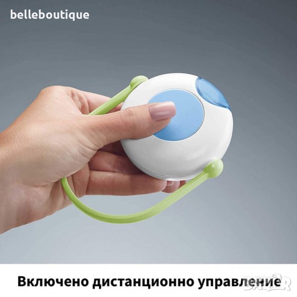 Въртележката е в комплект и с дистанционно, с което може да пускате и спирате играчката от разстояние, без да нарушавате съня на бебето.