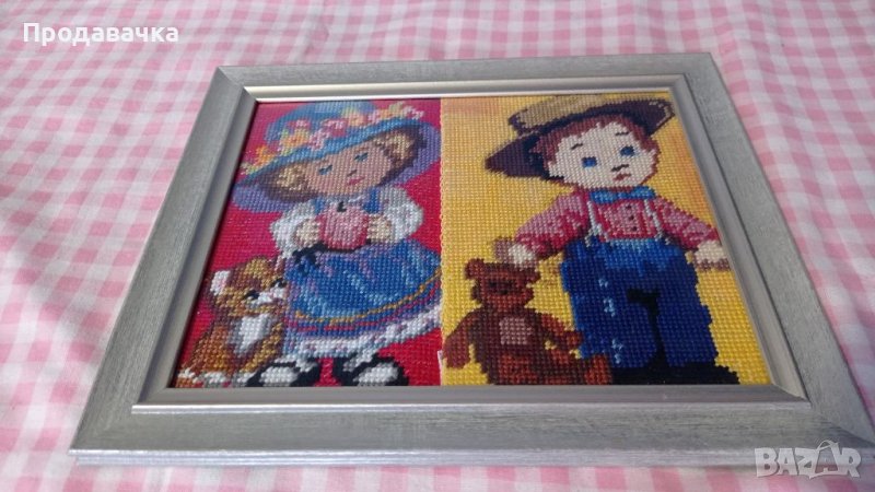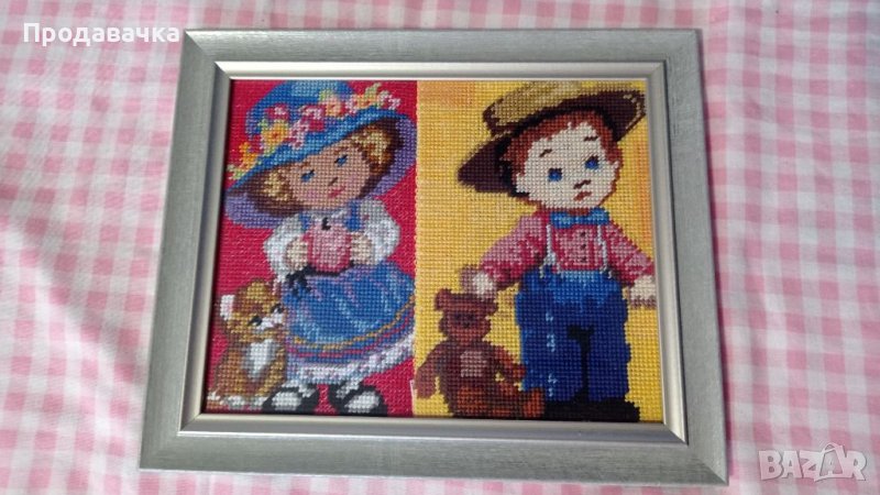 Продавам гоблен момченце 15/20см. И момиченце 15/20см. Гоблените са два в един! Общ размер: 30/40см. Бод: 4/4 продават се в рамка! Ако имате интерес пишете, ще ви отговоря възможно най бързо.