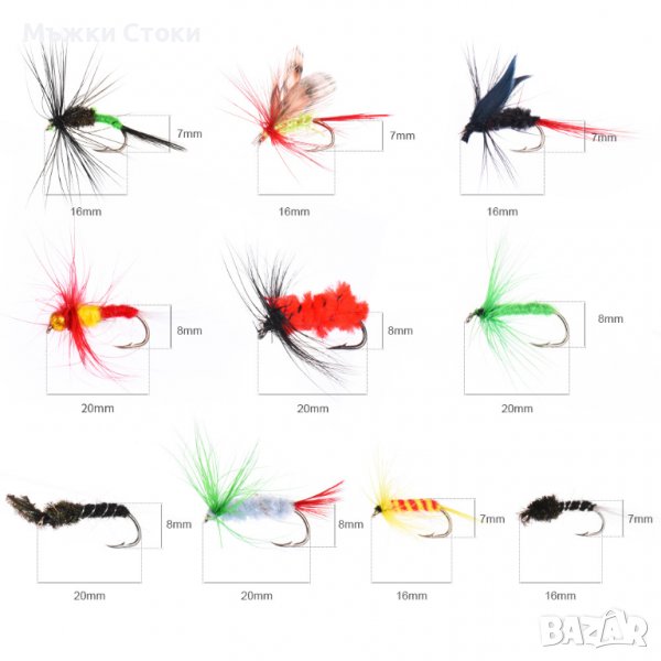 Муха / Мухи за риболов - Кутия с 100 броя мухи - 20 различни модела