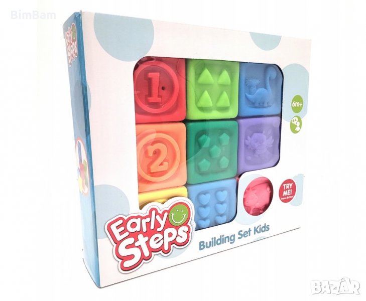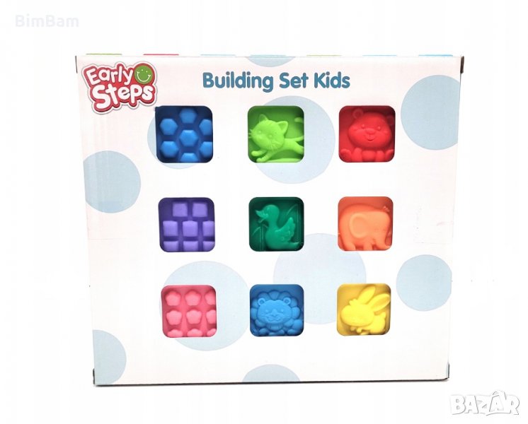 Комплектът съдържа 9 сензорни, гумени, цветни блокчета, с числа и животни, които ще се погрижат за правилното развитие на способностите и сетивата на детето. Всеки от елементите е с различен цвят и текстура. Играта е забавна и учи детето да разпознава цветове и форми.