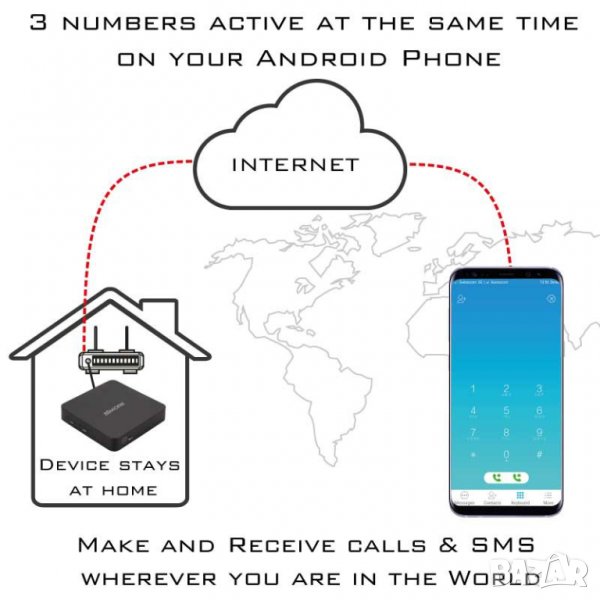 - Веднъж свързан към вашия интернет домашен рутер, DualSIM@home Android предава обаждания и SMS към вашия Android Mobile чрез интернет чрез приложението SIMHome.