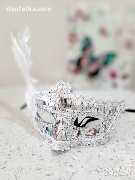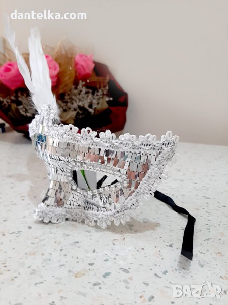Загадъчно домино за подсилване на ролеви игри. Стилно украсено с бели пера и блестящи ресни тип пайети. Има приклепени сатенени панделки, за да прилепне плътно към лицето. Традиционно