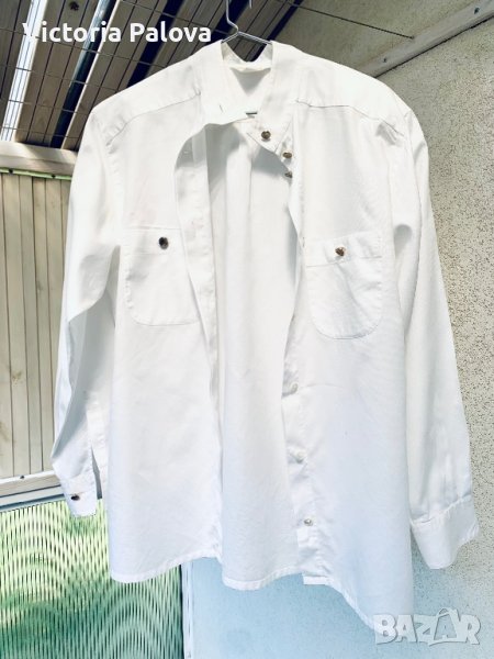 Ризата е луксов сегмент,немска компания от 1881година,световен лидер по производство на ризи.нещо съвсем различно-маркирани копчета,скритите копчета са перлени,тънки подплънки,високо качество памук(като се намачка не остават трайни гънки,постепенно се оправя),кройката е съвършена,може да се носи и отвън(има малки цепки).рамене-45см,ГО-57см,дължина-73см,ръкав-58см.