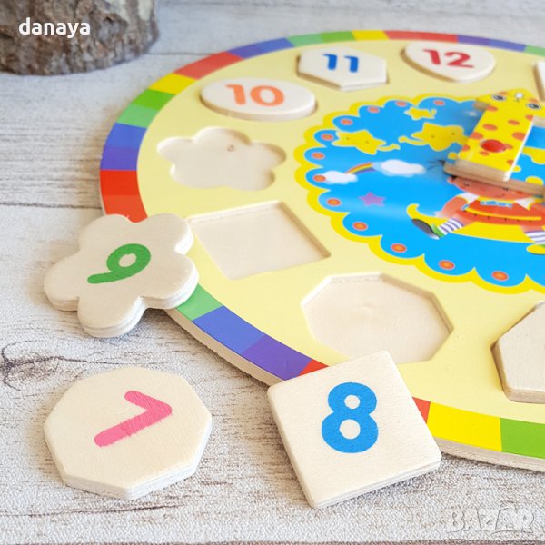 Колко е часът? Чудесна образователна играчка за малките деца. Часовникът съчетава в себе си сортиращ пъзел и часовник, като ще научи децата да познават часа, цветовете и геометричните фигури. Всяка цифра е на различна фигурка и цвят, която си има точно определено място, на което да бъде поставена. Забавна игра, развиваща фината моторика, цветоусещането и познаването на часа.