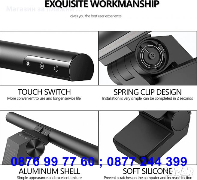 Устройството е оборудвано с модерни светодиоди, които осигуряват дълъг живот и ниска консумация на енергия. Монтажът е много лесен и бърз, с помощта на гравитационна дръжка. Настройката на яркостта е променлива. Елементите, изработени от мек силикон, предотвратяват всякакви драскотини по вашия лаптоп или монитор. Бутоните за управление са разположени на корпуса - бутон за плавно затъмняване, регулиране на източника на светлина, превключвател за включване / изключване.