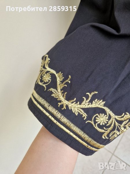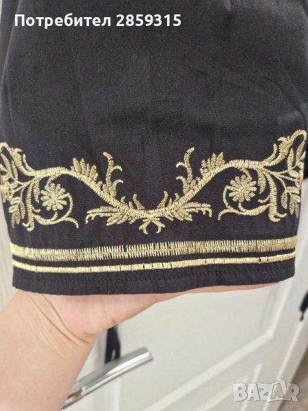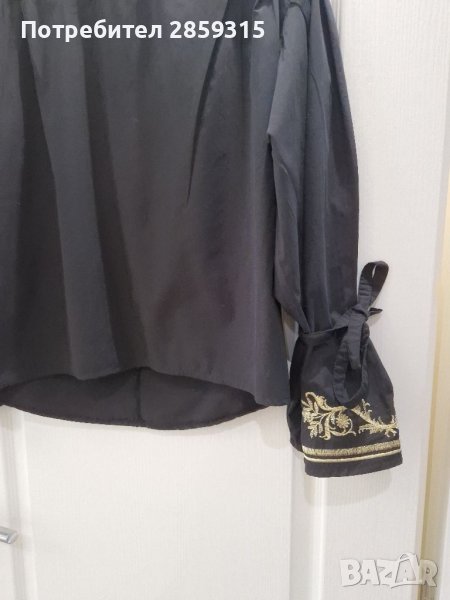 Дамска елегантна черна риза. Прекрасна черна материя - 80% памук + 20% полиестер. Ризата е разкроена на рамената, без копчета, отзад е леко издължена, а ръкавите са със страхотна златиста бродерия и се хващат с връзки. Изпрала съм я с цел да я нося на събитие, но така и не можах да присъствам на събитието и ризата си остана в гардероба без да я нося. Размер S, става и за М. Купих си я за 89 лв, но тъй като съм я изпрала и е без етикети я продавам на доста по-ниска цена.