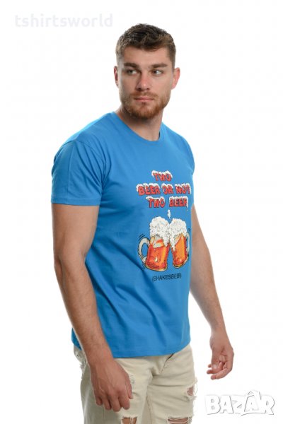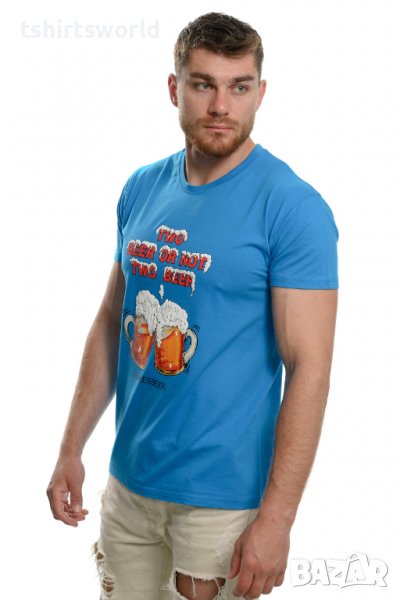 мъжка тениска в син цвят с трансферен печат Two Beer or not Two Beer, алкохол. Тениската е изработена в България под марката PRINTEX от висококачествен 100% пениран памук на 170 гр./м², който запазва цялостта на материята и наситеността на цветовете дълго време. С удобна кройка, тениската е свободна и позволява максимален комфорт при носене. Професионално изработен висококачествен трансферен печат с размер 23х33см, устойчив на пране с години. Тениската може да се пере при температура до 40 градуса. Спокойно можем да гарантираме за качеството на изработката и ярките цветове на дизайна.