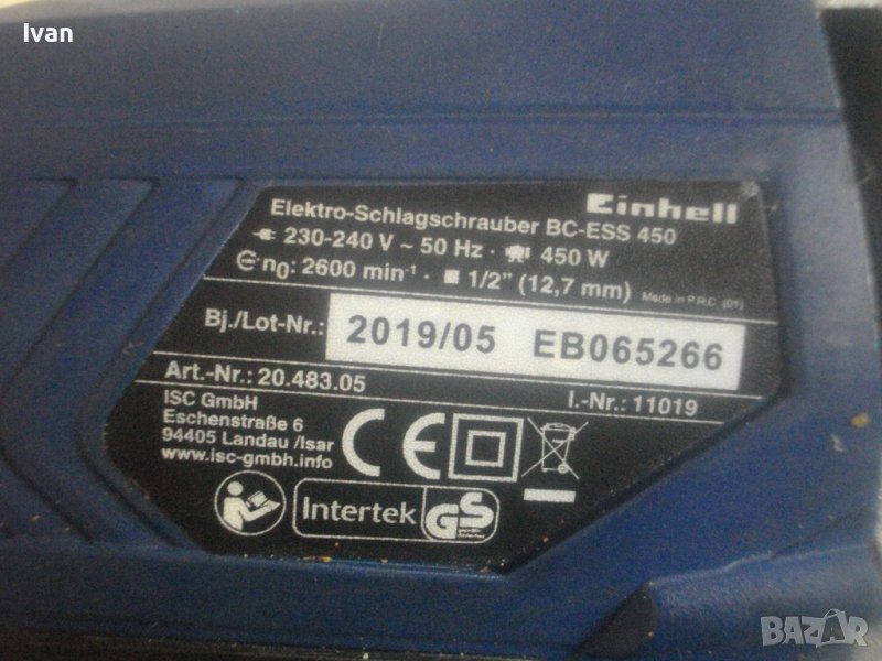 Марка и модел на гайковерта - Einhell BC-ESS 450. Производство - оригинално Германия - 2005 г - Germany. Размер глава за торсове накрайници - 1/2 .- 12,7 мм. Скорост на мотора - 2 800 оборота/мин. Мощност на мотора - 450 вата. Четки - външни.