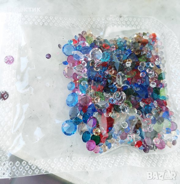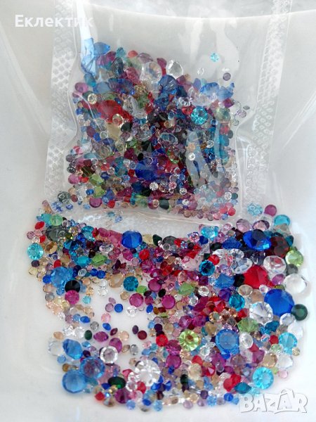 Пакетче с микс от различни цветове и големини фасетирани камъчета (брилянт) от стъклен кристал. Пакетчето е с размери 9 х 5.5 см и тежи ок. 10 гр. Налични са 2 пакетчета. (Цената е за 1 пакетче). Цена 3.20 лв.
