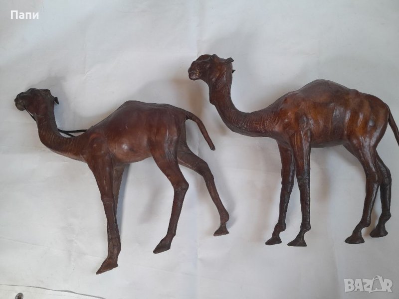 Ръчно правени дървени камили,облечени в естествена кожа.Ранна изработка в началото на 20-ти век. Много реалистични,а на живо са още по-красиви. В/52 см. Ш/55 см.
