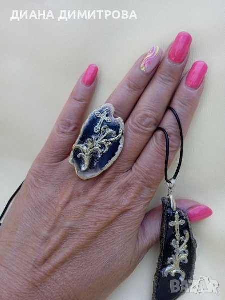 Ръчно декориран комплект /сет/бижута пръстен и колие с черен ахат! Подарък за жена!! → Обява 37663192